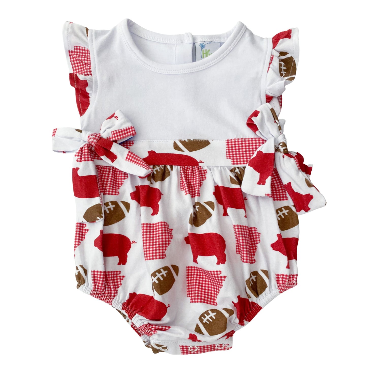 Your little girl will look adorable in this Pig Football Ruffle Bubble made from 95% cotton and 5% spandex. Nothing says team pride like this fun and playful football design featuring your favorite state and beloved pig. Perfect for your child's next game day or playdate!