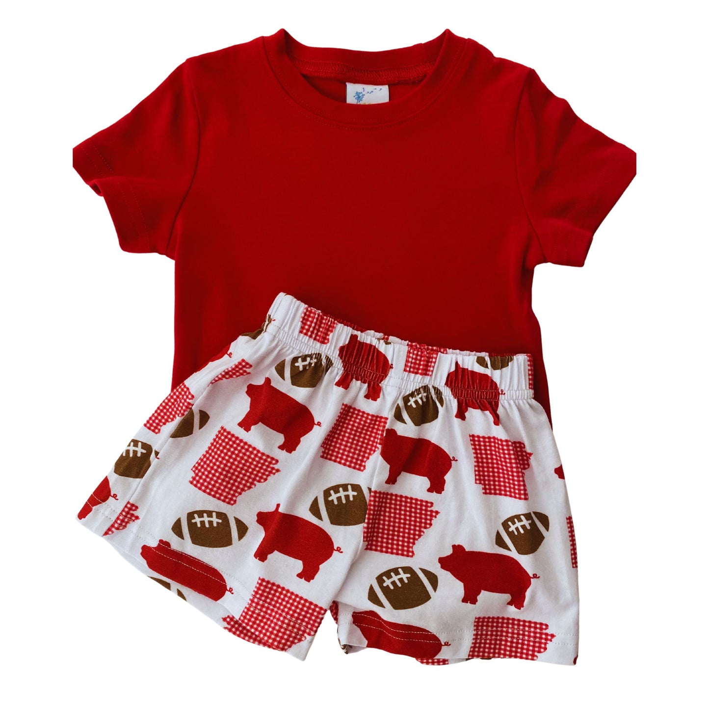 Your little guy will look adorable in this Pig Football Short Set made from 95% cotton and 5% spandex. Nothing says team pride like this fun and playful football design featuring your favorite state and beloved pig. Perfect for your child's next game day or playdate!
